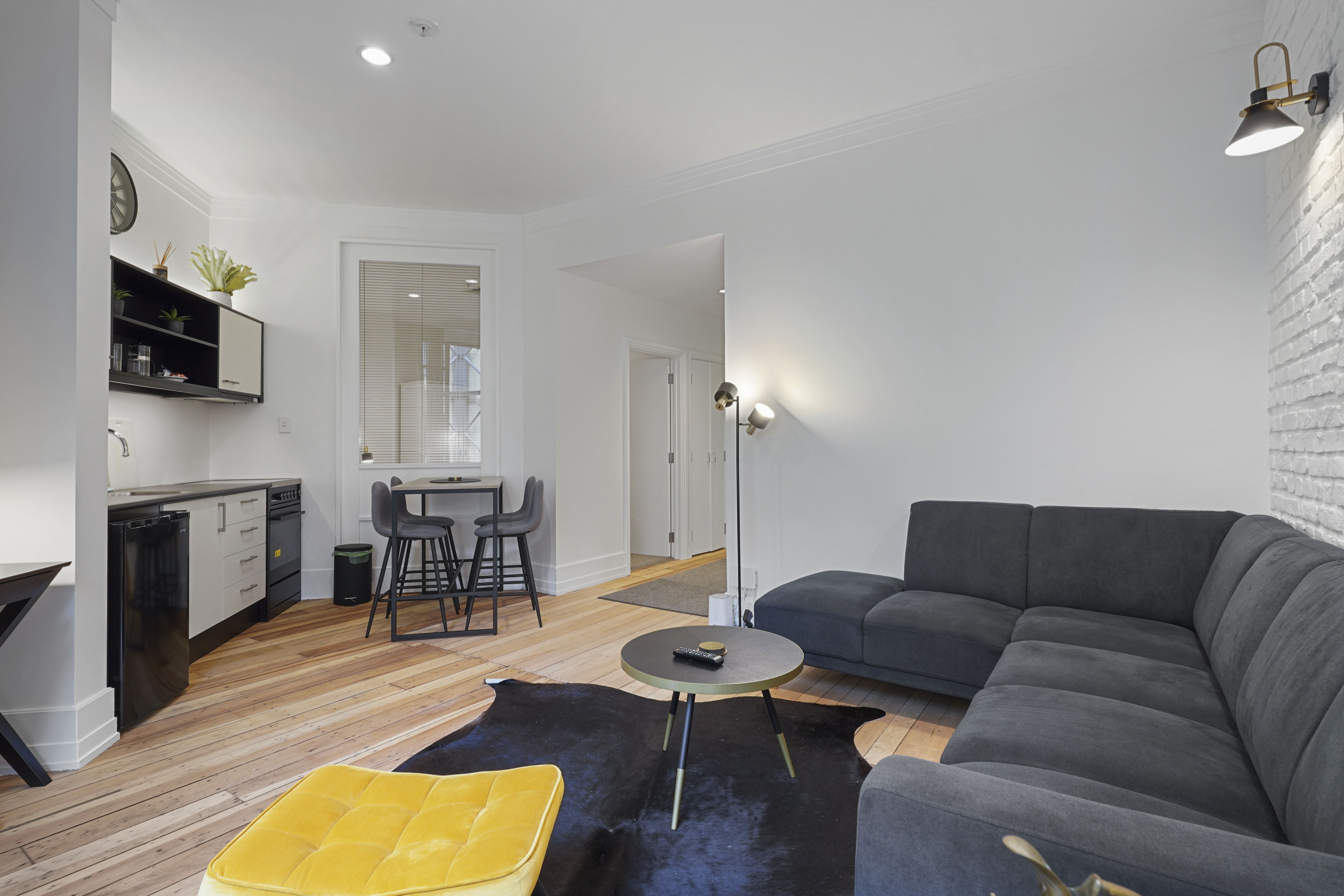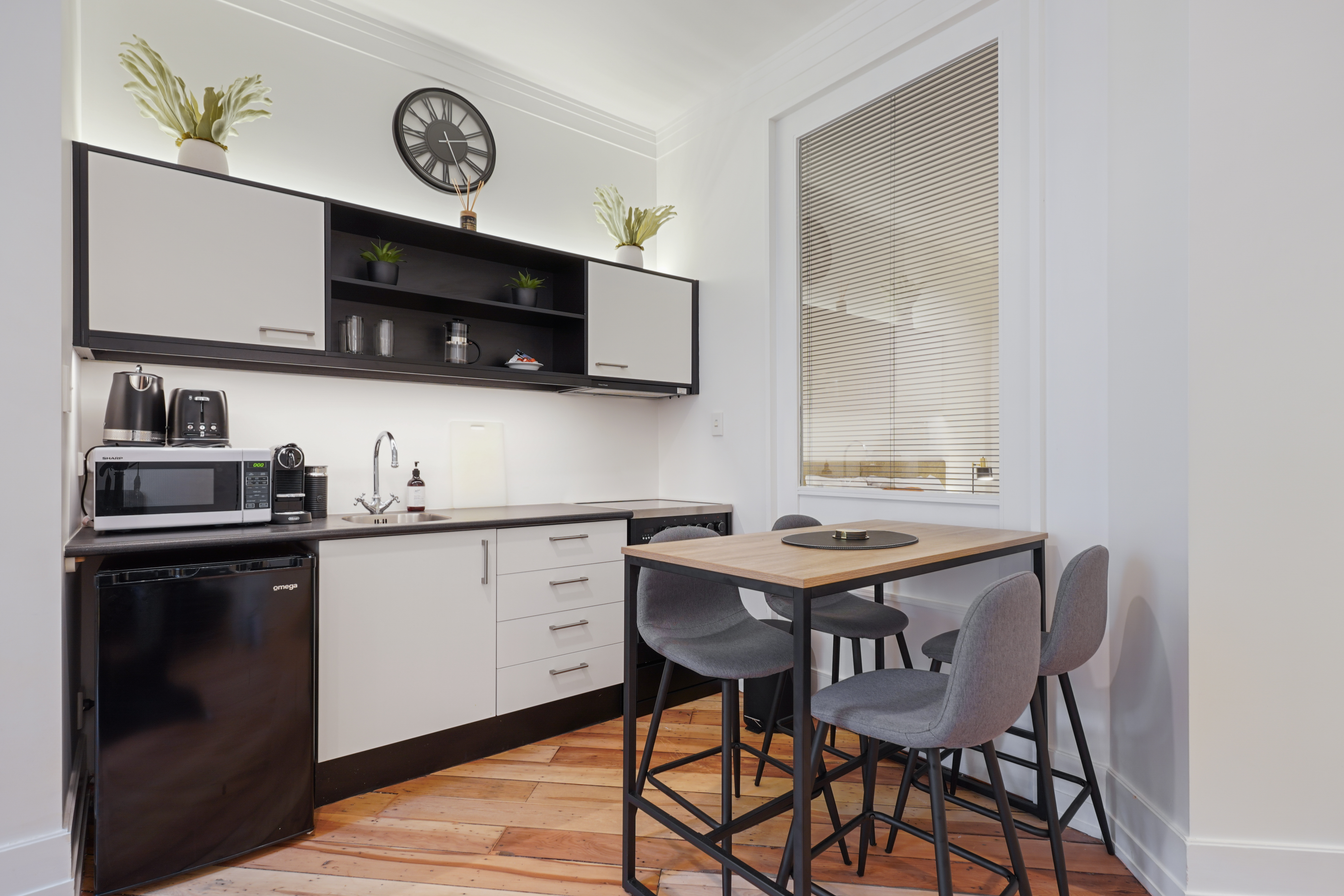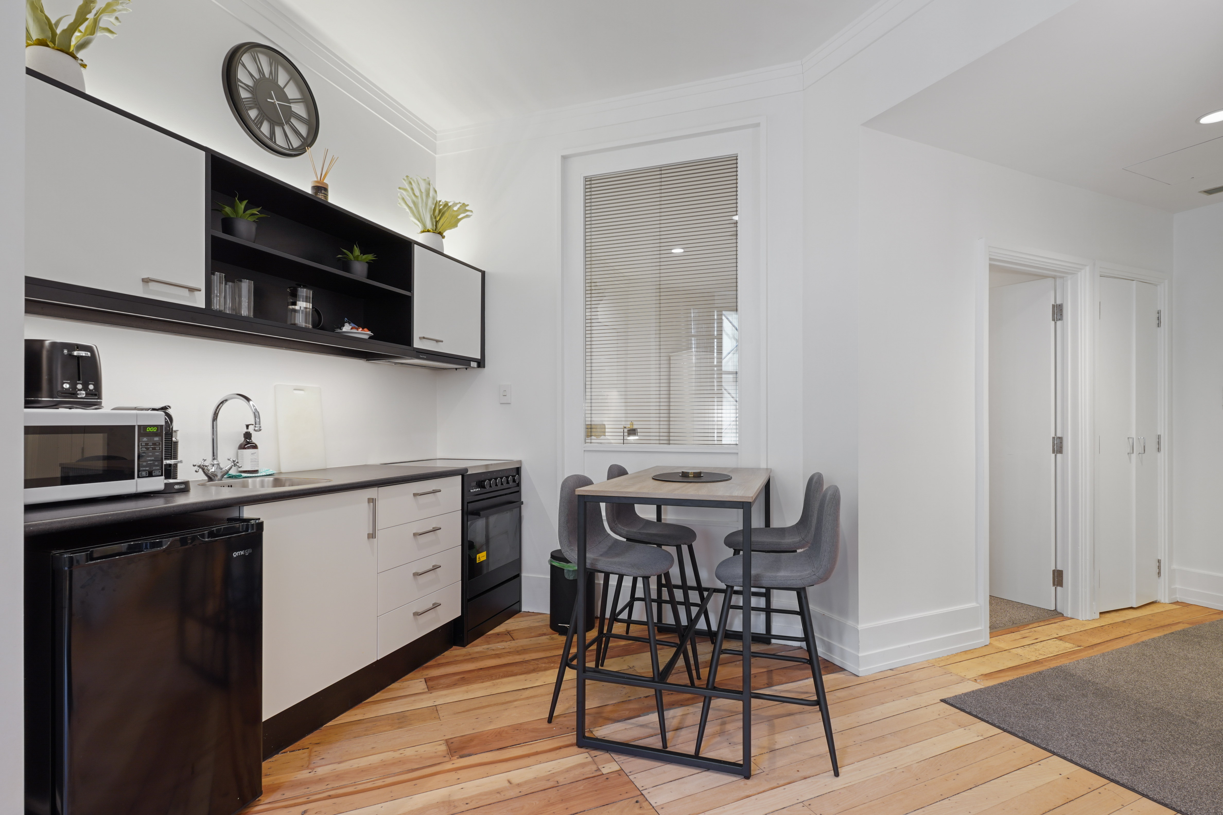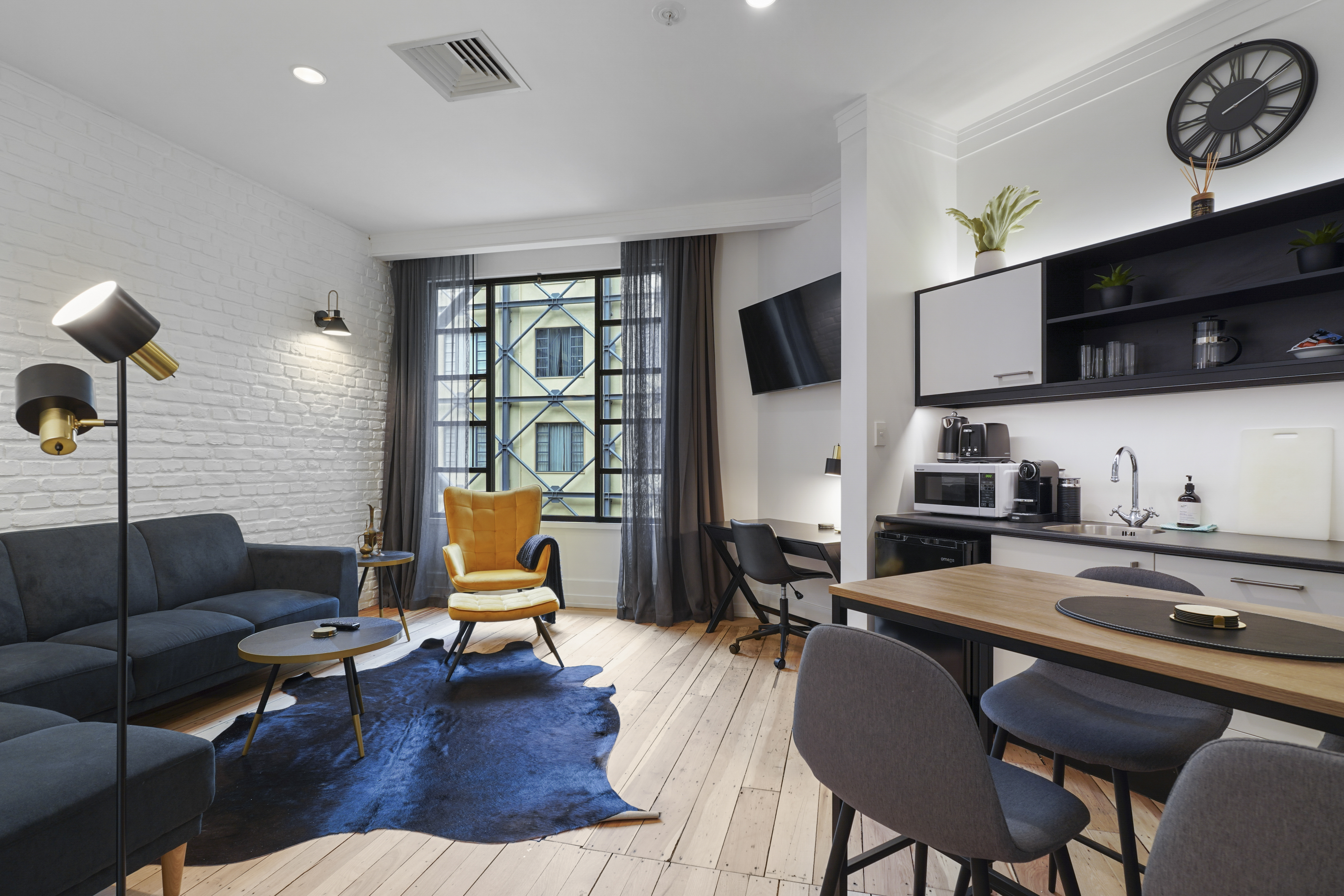 We selected furniture that would give flexibility to how the space could be used – by a single person or couple, a professional travelling for work, or someone wanting a place to rent in central Auckland. A small desk in a nook off the living room can be used for work or studying, or as a side table when entertaining. Instead of a traditional dining table, we opted for a sleek, rectangular bar leaner with room for four stools around. It can be used for meal prep, dining, entertaining or as an additional workstation – and it can be easily repositioned as needed.