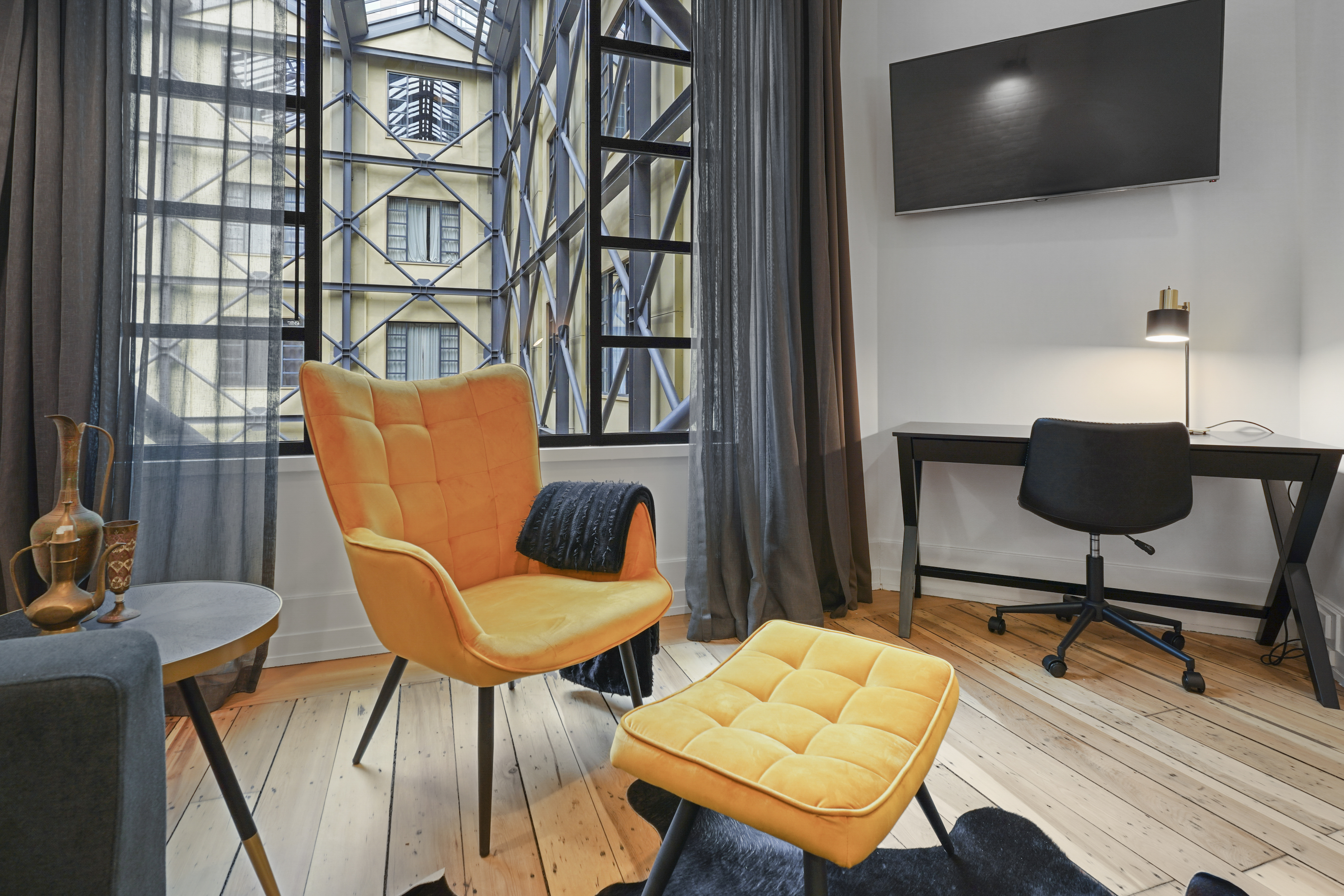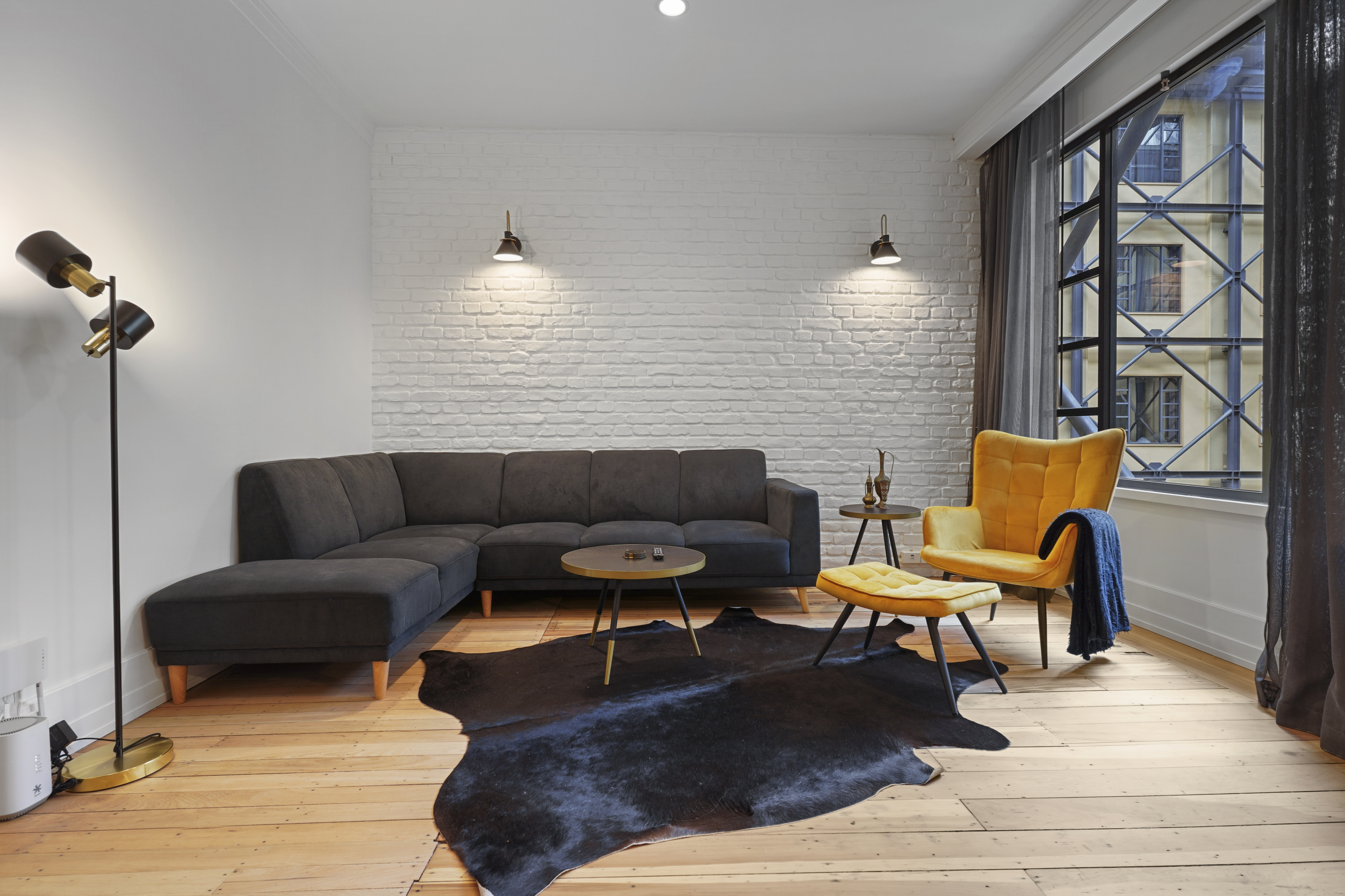 We put in additional lighting to replace the very functional hotel lighting that was in place previously. It was very minimal and consisted mainly of just a light over the dining table and one light in the kitchen. We added a few lamps for a cosy feel and used a couple of new wall lights to draw attention to the beautiful brick wall.