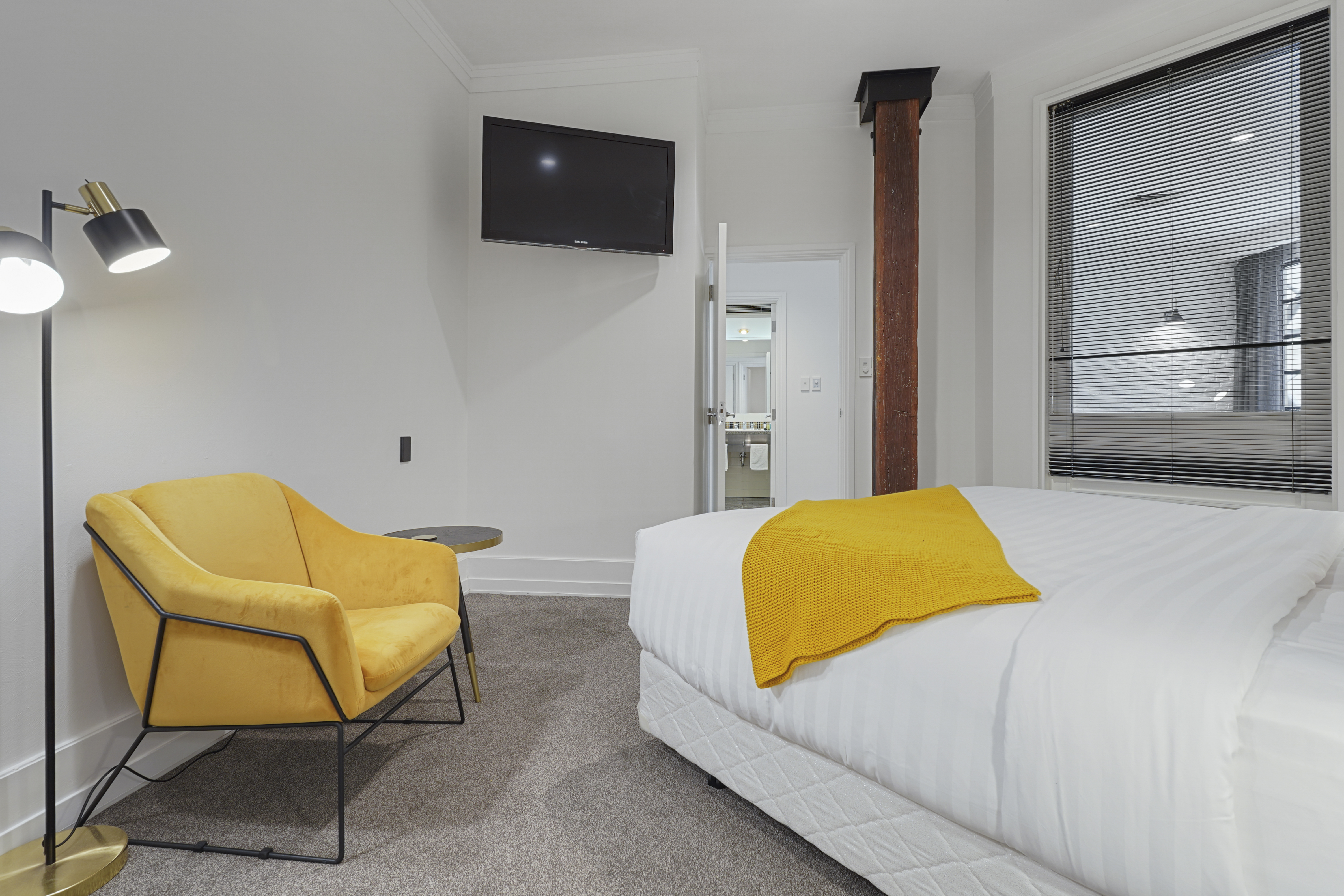 There was also a permanently locked door off the living room that was used back when there were adjoining hotel rooms. With it no longer needed, we removed the door handle and put up a brick veneer wall which we painted white. There’s no longer any trace of the previous door, and the texture of the wall gives the space a rustic yet modern appearance that blends nicely with the exposed timber features.