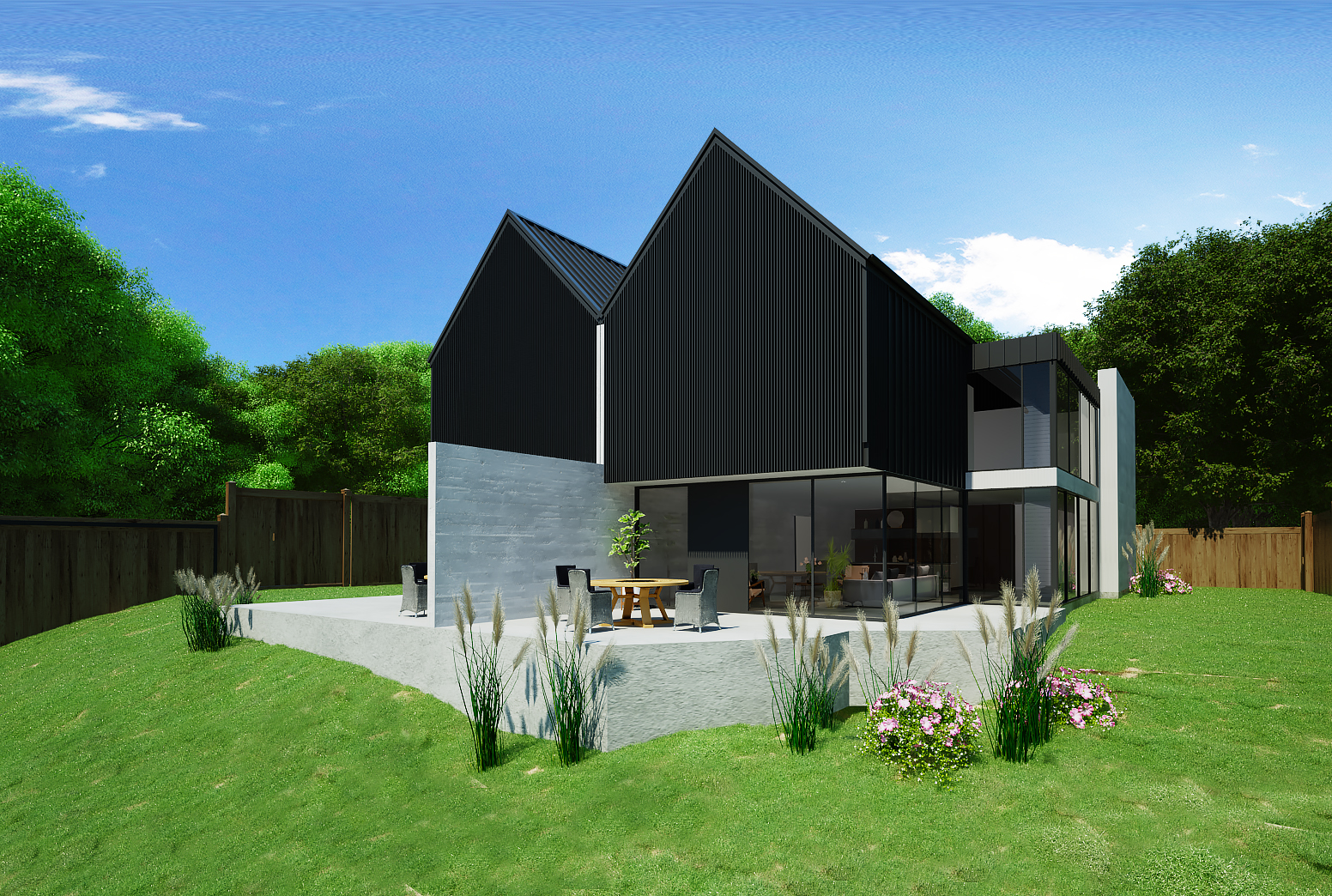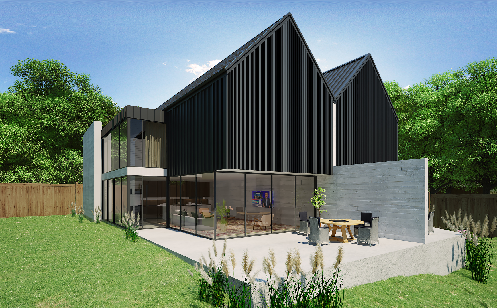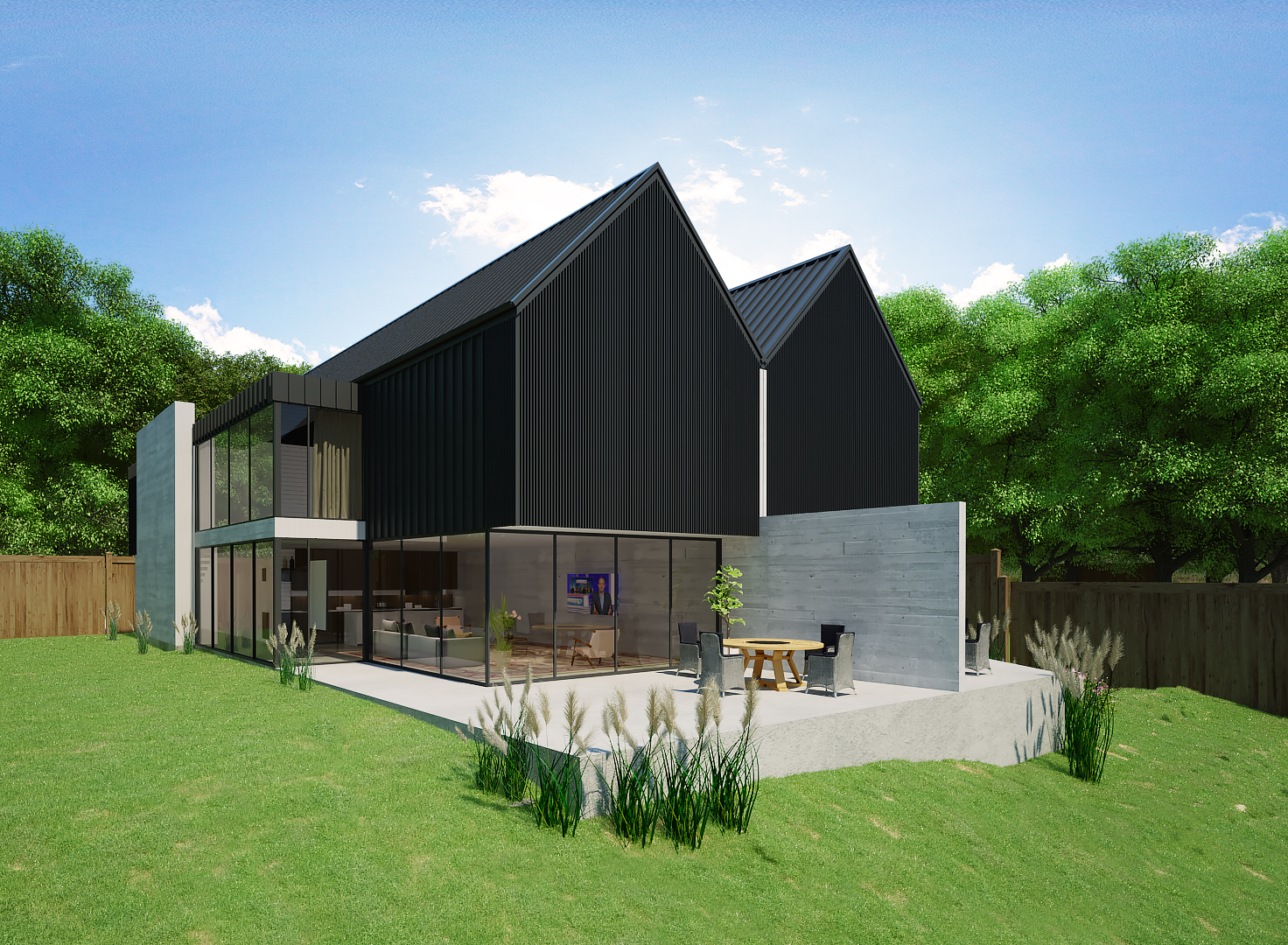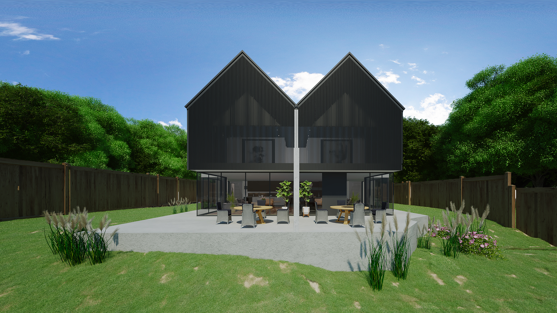 The material palate for these homes was selected to be low maintenance and to endure many years of living by the sea. We used simple, solid concrete in situ walls on the external ground floor, paired with the lightweight folded metal cladding above to form the two gable ends and screens on the east and west of the buildings. These provide some protection from the sun and privacy for the bedrooms upstairs that face the road.