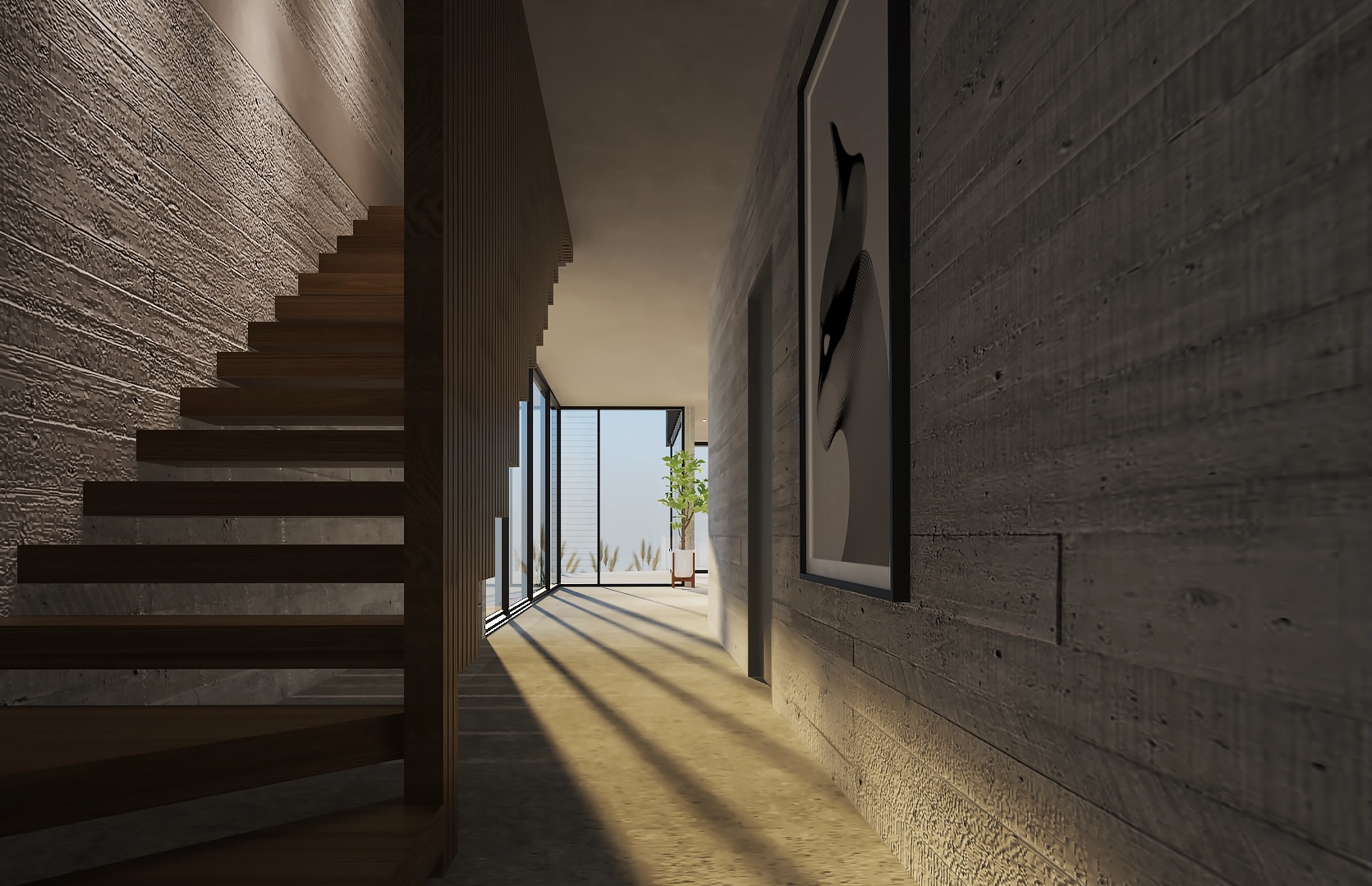 Another beautiful design element in these homes is created by the subtle lines throughout. When the sunlight hits at certain angles, the open riser stairs, the timber panelling on the walls and the exterior wall fins all cast elegant shadow lines that direct the eye toward the large windows.