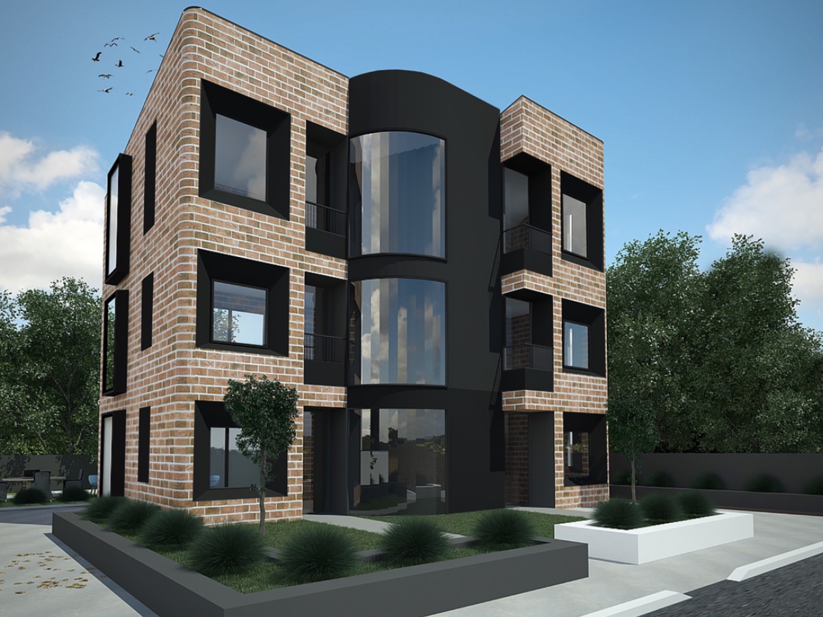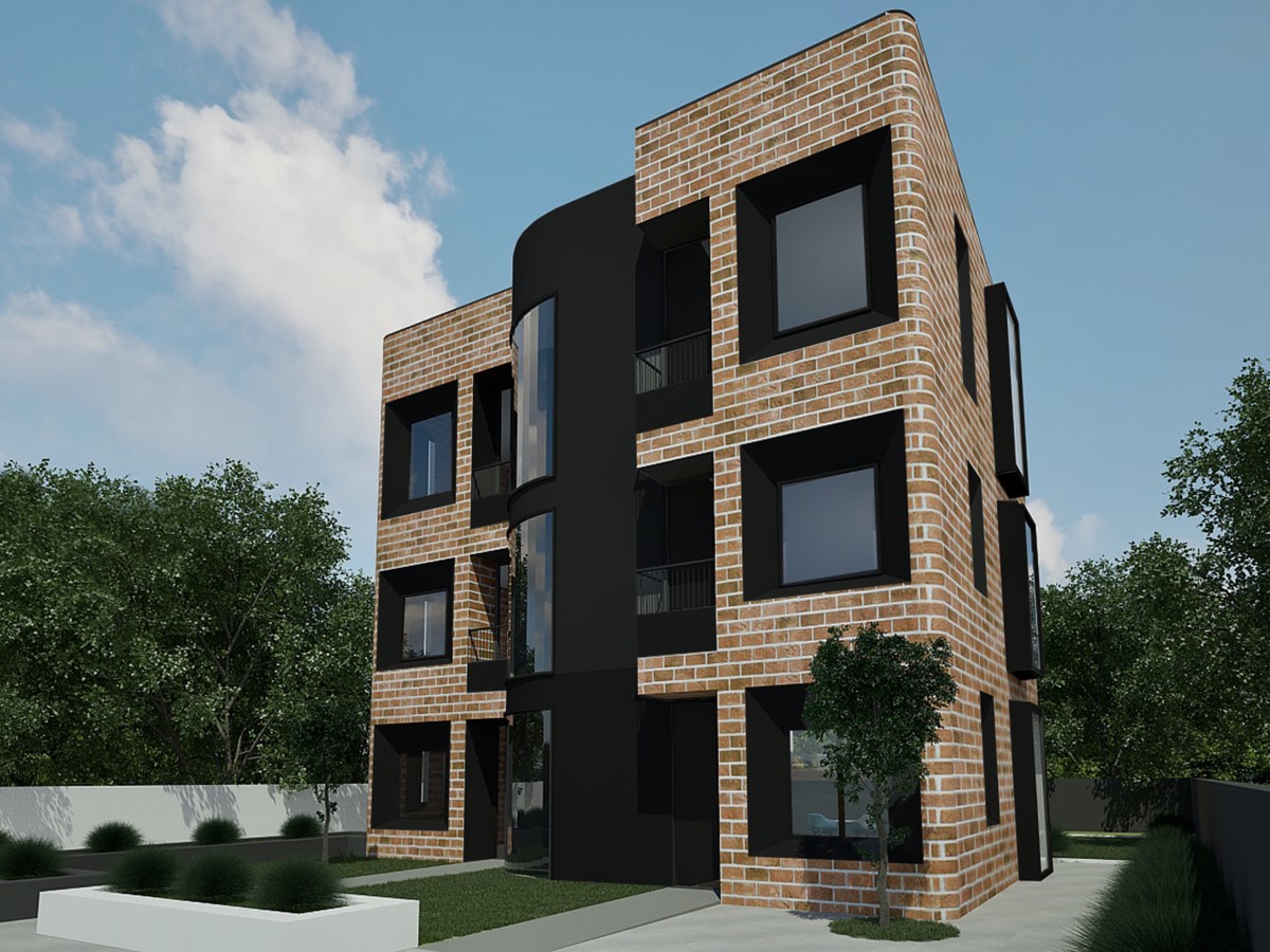 Approaching the apartment building from the road, you see two red brick wings (west and east) connected by a central spine – a solid pre-cast/plaster stairwell painted in a dark charcoal colour. This central spine is one of the unique design features of this project. Its curved edge and full height glazing give the building a slightly art deco style and create a real statement piece for the building’s entrance.