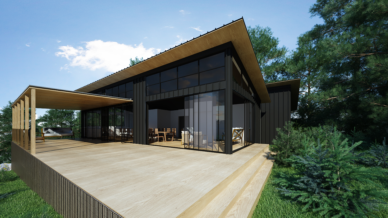 The design materials we used complement the natural surroundings beautifully. Using folded metal cladding on the upper level of the house has meant that we’ve been very calculated about the location of windows, ensuring we have clean lines and symmetry where needed.